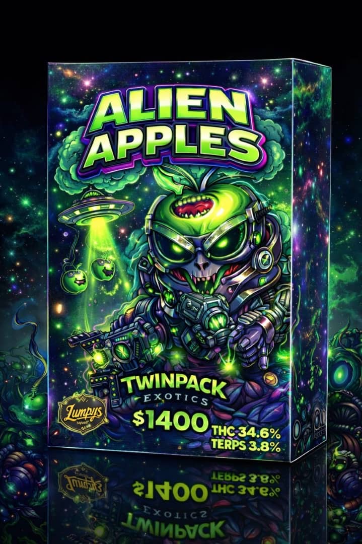 Alien Apple is a potent hybrid, often leaning indica dominant while still keeping a balanced, smooth high. This cut is known for serious potency, commonly testing in the 30–34% THC range, and delivering loud flavor from start to finish.